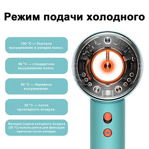 100 °C — максимальная мощность для быстрого результата. 80 °C — баланс скорости и бережного отношения к волосам. 60 °C — деликатный режим для тонких или окрашенных волос. 28 °C — холодный воздух для фиксации укладки и придания блеска