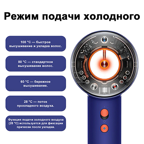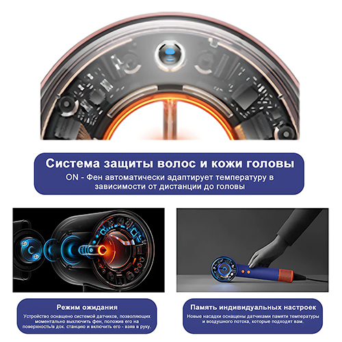 Включено – автоматически снижает температуру, когда она приближается к коже головы.