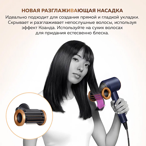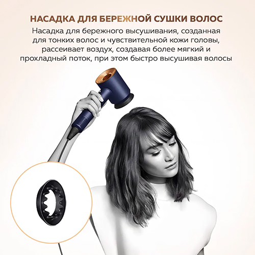 Дополнительная комплектация: противоскользящая насадка для прямых волос, насадка для бережного высушивания волос