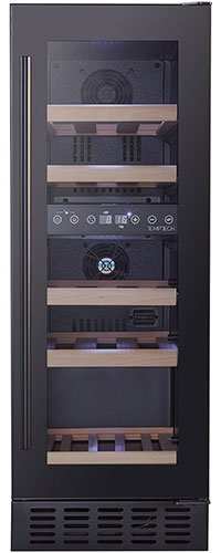 Дверца шкафа оснащена двойным стеклом с УФ-фильтром, который защищает вино от вредных ультрафиолетовых лучей и тепла. Активный вентилятор равномерно распределяет температуру внутри шкафа.