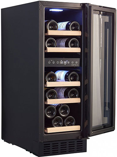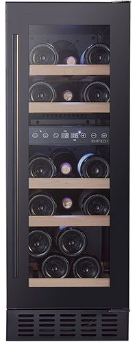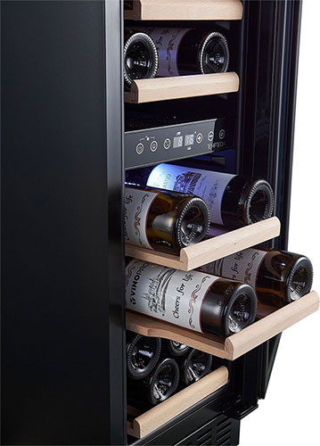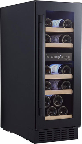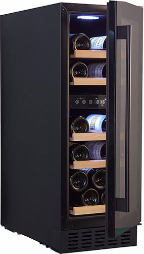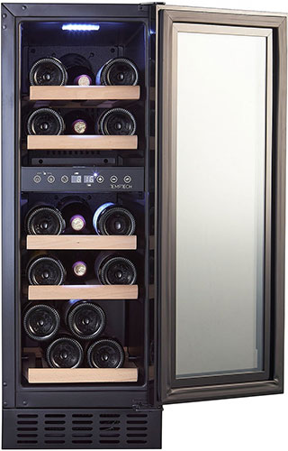 Шкаф выполнен в современном дизайне с чёрной стеклянной передней панелью, полками из бука и внутренней светодиодной подсветкой. Управление осуществляется с помощью сенсорной панели и цифрового дисплея.