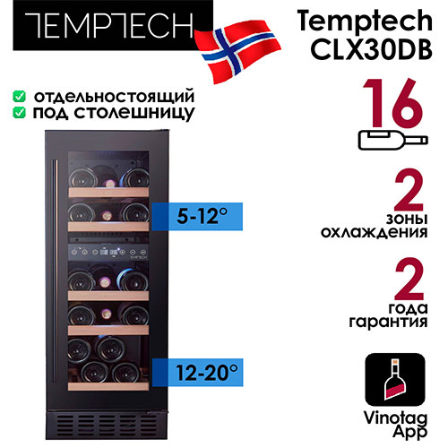 Винный шкаф Temptech CLX30DB - это стильное и функциональное решение для хранения и охлаждения вина. Он имеет две температурные зоны: 5-12°C и 12-20°C, что позволяет подобрать оптимальный режим для разных видов вин. Вместительность шкафа - до 16 бутылок.