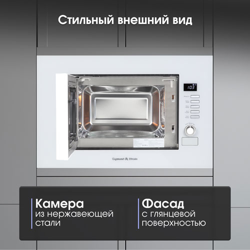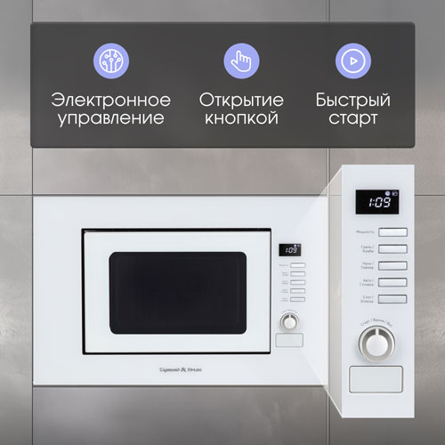Встраиваемая микроволновка Zigmund & Shtain BMO 21 W позволяет быстро разморозить продукты, приготовить различные блюда и разогреть их.