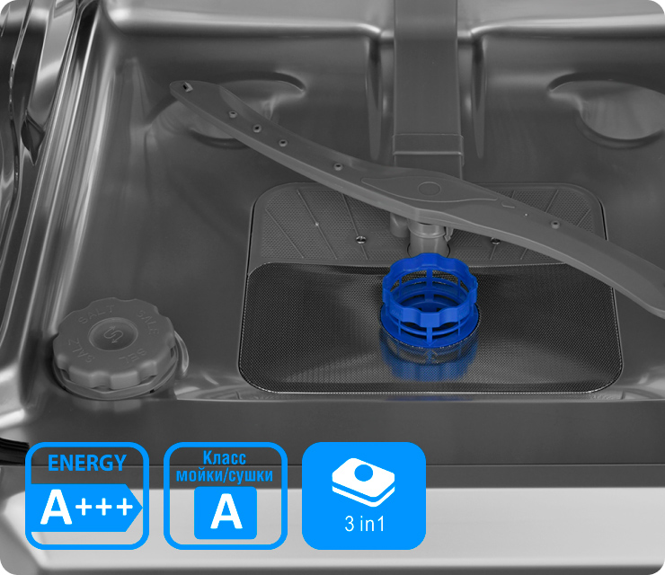 - Уровень шума 49 дБ - Класс энергоэффективности/Мойки/Сушки - A +++/ A / A - Расход воды за цикл 9,8 л - Использование средств 3 в 1 - Индикаторы соли, ополаскивателя и воды - Фиксация открытой двери в любом положении - Дозагрузка посуды - Регулировка жесткости воды – 6 уровней - Система смягчения воды - Стальной фильтр - Логотип на корзинах