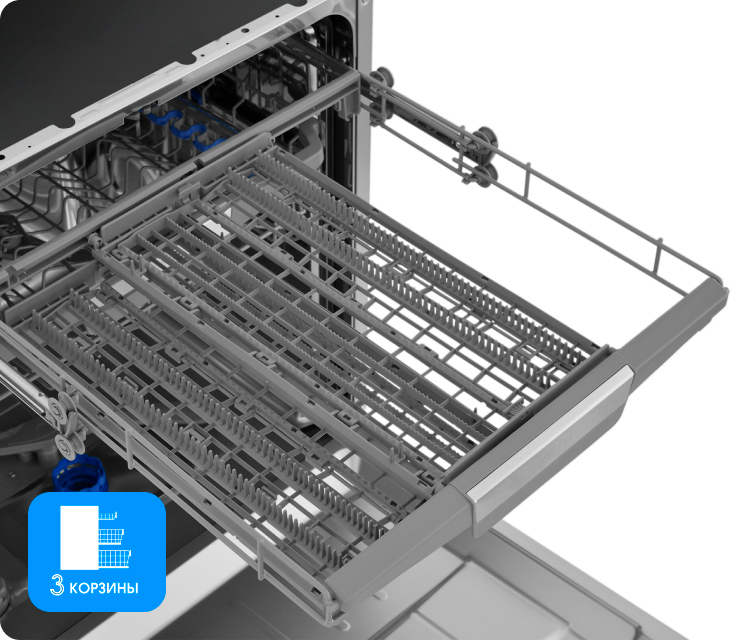 Третья корзина для столовых приборов имеет функцию трансформации, что позволит увеличить пространство во второй корзине под широкие тарелки и высокие стаканы.