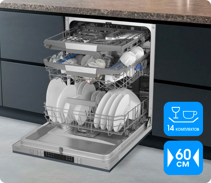 Вместительная загрузка на 14 комплектов, наличие режимов для разных типов посуды, регулируемые корзины для удобства.