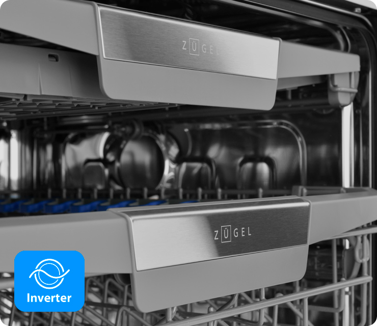 Инверторный двигатель имеет электронный инвертор, который более точно управляет процессом мойки, скоростью и мощностью двигателя, увеличивает энергоэффективность прибора, снижает уровень шума