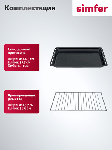 В комплект входят стандартный противень с антипригарным покрытием и хромированная решетка.