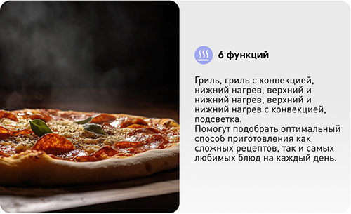 6 функций (гриль, гриль с конвекцией, нижний нагрев, верхний и нижний нагрев, верхний и нижний нагрев с конвекцией, подсветка) помогут подобрать оптимальный способ приготовления как сложных рецептов, так и самых любимых блюд на каждый день.