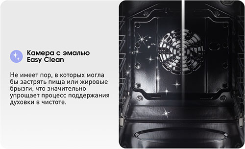 Эмаль Easy Clean не имеет пор, в которых могла бы застрять пища или жировые брызги, что значительно упрощает процесс поддержания духовки в чистоте.