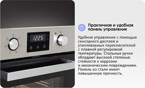Удобное управление с помощью сенсорного дисплея и утапливаемых переключателей со ступенчатой регулировкой пламени. Стальные ручки обладают высокой степенью стойкости к коррозии и механическим повреждениям.