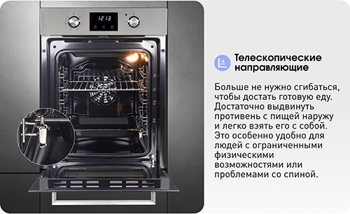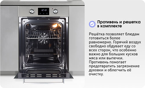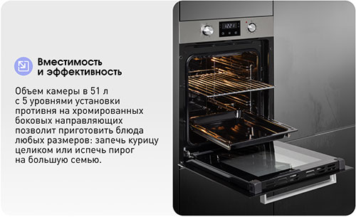 Объем камеры в 51 л с 5 уровнями установки противня на хромированных боковых направляющих позволит приготовить блюда любых размеров: запечь курицу целиком или испечь пирог на большую семью. В комплекте есть противень и съемная решетка.