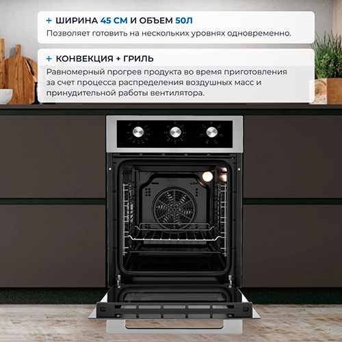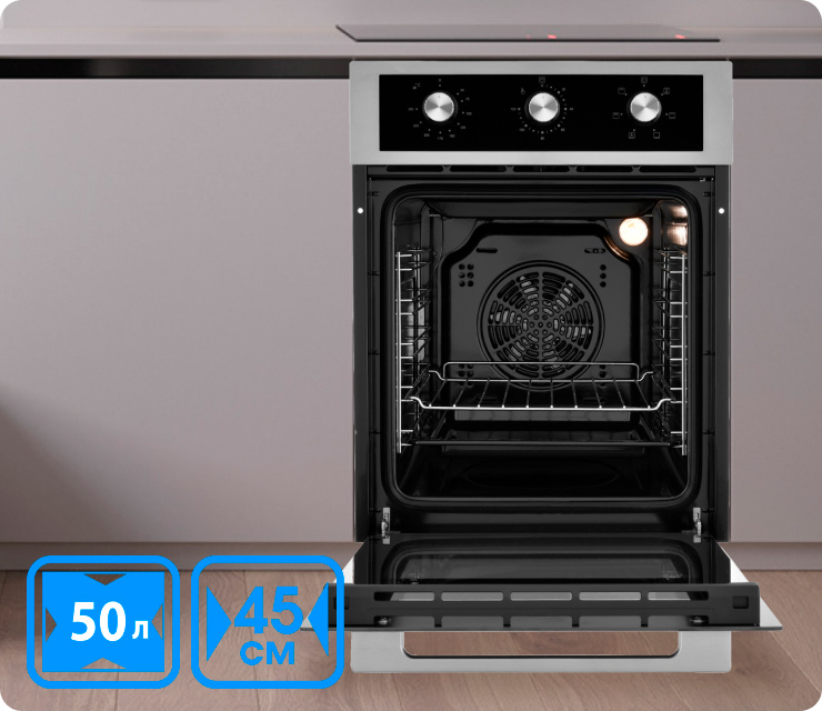4,00 | | Преимущества: | Компактный форм-фактор, удобные утапливаемые переключатели, равномерное распределение тепла, гриль и конвекция, доступная цена. | | Недостатки: | При длительном использовании дверца конечно греется. | | Комментарий: | Компактные размеры оказались удивительно практичными для небольшой кухни — модель идеально вписалась в наш ограниченный интерьер. Гриль и конвекция отлично справляются со своей задачей: блюда получаются сочными, аппетитными, выпечка всегда удаётся на славу. Конечно, объём хотелось бы чуть больше для крупных готовок, но для стандартных нужд этого вполне хватает.