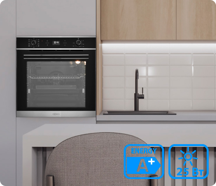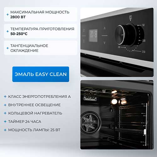 - Класс энергопотребления А - Максимальная мощность 2800 Вт - Температура приготовления 50-250°C - Тангенциальное охлаждение - Внутреннее освещение - Кольцевой нагреватель - Таймер 24 часа - Мощность лампы: 25 Вт