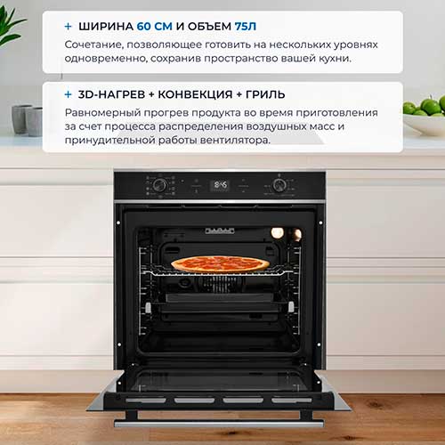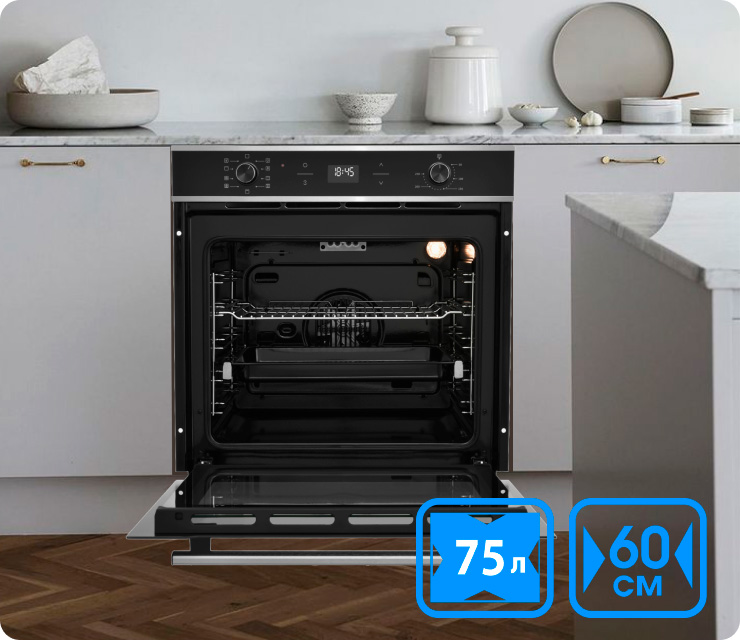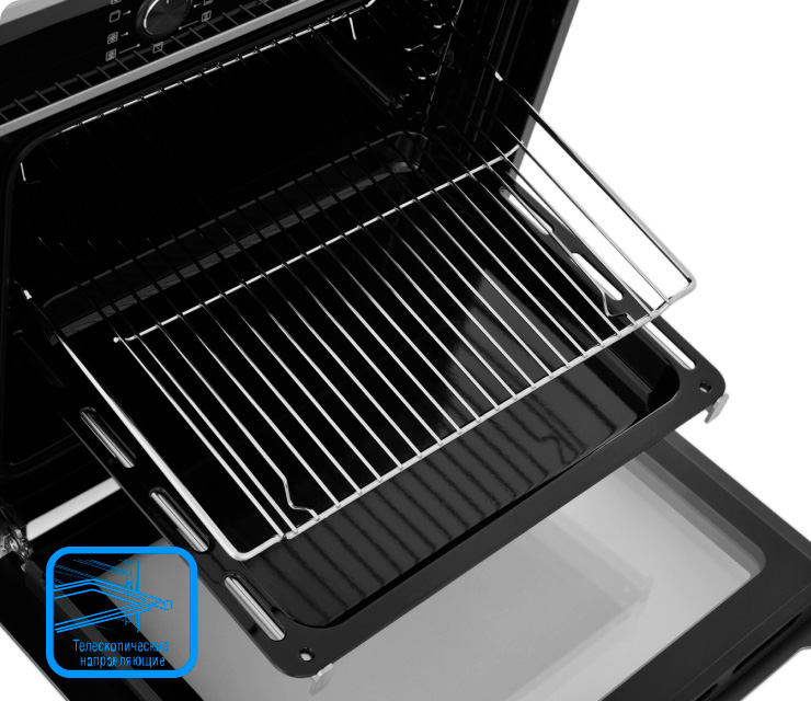 Удобные телескопические направляющие, 9 рабочих режимов, гриль обычный и с конвекцией. Объем духовки в 75 литров и наличие верхнего и нижнего нагрева позволяет качественно готовить сразу несколько блюд.