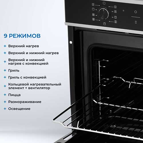 - Верхний нагрев - Верхний и нижний нагрев - Верхний и нижний нагрев с конвекцией - Гриль - Гриль с конвекцией - Кольцевой нагревательный элемент + вентилятор - Режим Пицца - Размораживание - Освещение
