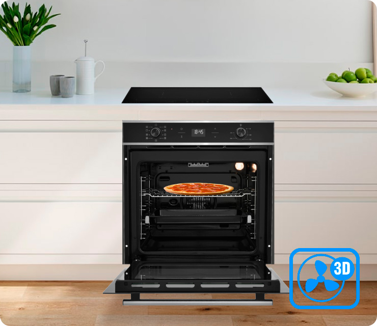 Равномерный прогрев продукта во время приготовления за счет процесса распределения воздушных масс и принудительной работы вентилятора.