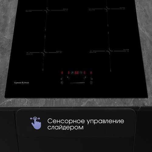 Сенсорная панель со слайдером делает управление интуитивно понятным. Чтобы включить прибор и выставить нужную мощность нагрева, не нужны физические усилия. Достаточно коснуться кнопки включения и индикатора конфорки, а затем провести пальцем по слайдеру, пока на LED-дисплее не появится нужная мощность.