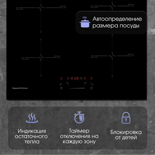Таймер отключения до 99 минут на каждую зону нагрева избавляет от необходимости постоянного контроля за процессом приготовления, например, при варке яиц и макарон.