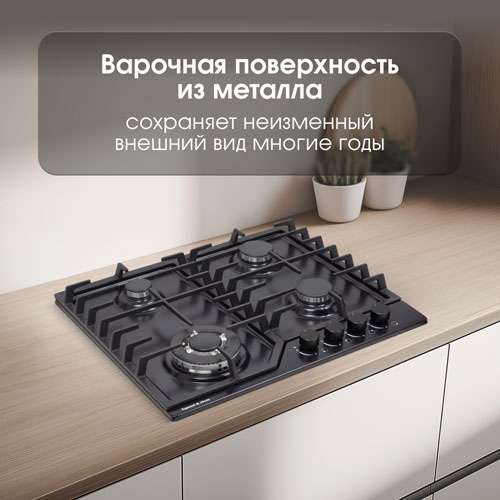 Варочная поверхность выполнена из металла, покрытого специальной матовой эмалью, что придает ей не только эстетичность, но и надежность. Металл устойчив к высоким температурам и механическим повреждениям, обеспечивая долгий срок службы и легкость в уходе.
