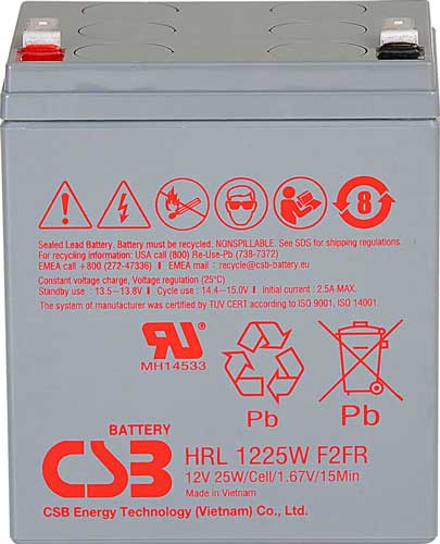 Свинцово-кислотный аккумулятор CSB HR 1225W F2 FR (ёмкость 6.25 Ач, напряжение 12 В) разработан для разряда высоким током за короткое время. Батарея может работать как в циклическом режиме (более 260 циклов разряда-заряда), так и в буферном (до 5 лет). CSB HR 1225W F2 FR использует технологию AGM (стекловолоконные сепараторы, пропитанные электролитом), а корпус из ABS-пластика полностью герметичен (долив воды не требуется), что позволяет использовать аккумулятор в любом положении. Более подробную информацию можно получить в разделе « Документы ». Дата производства аккумулятора CSB HR 1225W F2 FR указана на крышке в виде символьного кода.