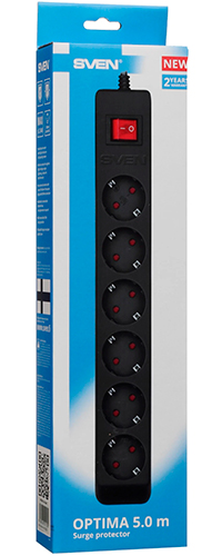 Серия сетевых фильтров-удлинителей SVEN Optima призвана обеспечить стабильное и качественное питание различных устройств и предполагает разнообразные сценарии размещения и применения. В зависимости от условий использования пользователь может выбрать один из трех вариантов длины кабеля: 1,8 метра, а также 3 и 5 метров. Шести универсальных розеток формата CEE 7/4 с заземлением хватит для решения большинства задач, при этом они отлично удерживают как российские, так и европейские вилки.