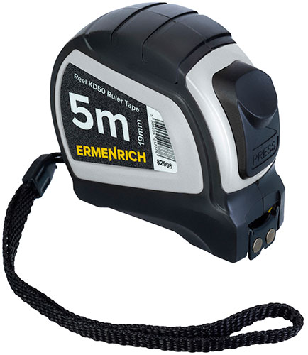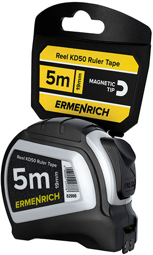 Ermenrich Reel KD50 – строительная рулетка с полотном из матовой стали и магнитным зацепом. Разметка расположена с одной стороны ленты, максимальная длина измерений составляет 5 метров. Рулетка устойчива к повреждениям и истиранию покрытия, отлично подходит для решения множества базовых измерительных задач дома, на производстве, в профессиональной деятельности.