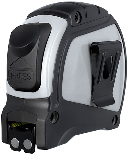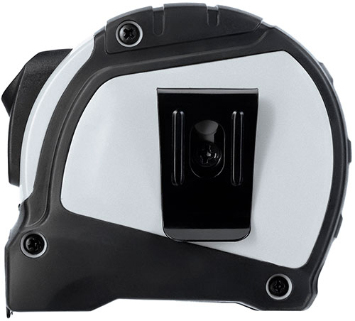 Корпус рулетки выполнен из прочного пластика и обрезинен. С тыльной стороны расположено поясное крепление.