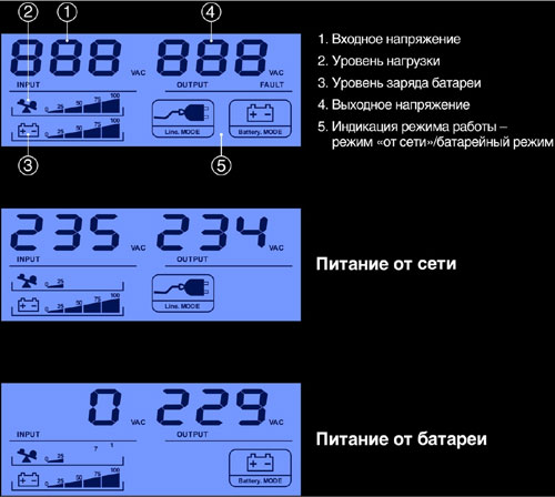 Примечание: Обращаем Ваше внимание на то, что при работе ИБП в режиме «от сети» происходит непрерывное измерение входного напряжения, и, при необходимости, выполняется его корректировка. Если напряжение в сети ниже 198В, то происходит его повышение. Если напряжение в сети выше 242В, то происходит его понижение. Если напряжение сети находится в пределах 198В…242В, то напряжение не корректируется, так как оно соответствует требованиям ГОСТ, и, соответственно значения входного и выходного напряжения на цифровых индикаторах будут одинаковы.