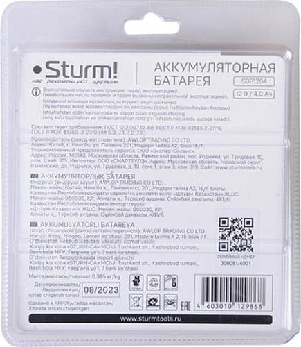 Аккумулятор Sturm! SBP1204 12В, 1BatterySystem12V, 4.0 Ач, Li-Ion, отзывы (0) | Добавить отзыв |