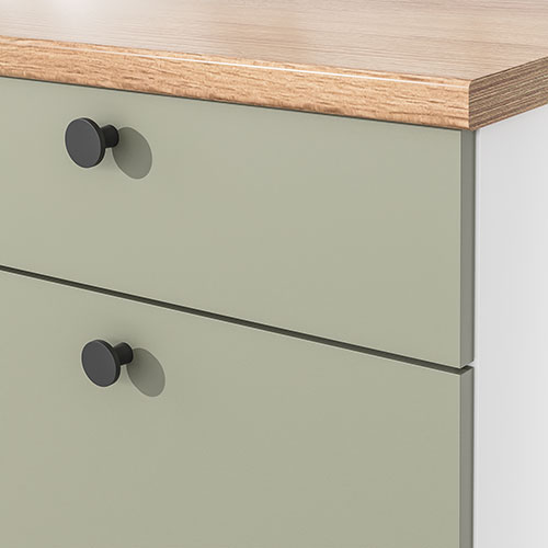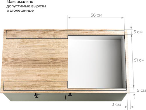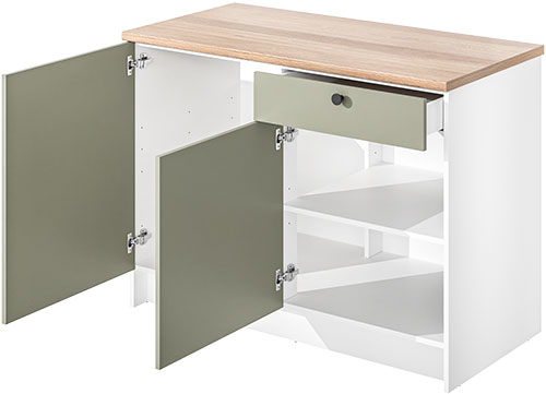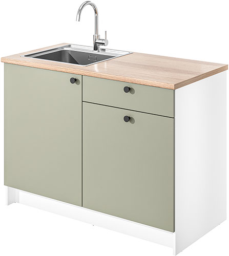 В модуле достаточно места, что бы разместить кухонную утварь. В секции для мойки / смесителя можно разместить контейнеры для отходов, бытовую химию и даже фильтр для воды. А выдвижной ящик в соседней секции оптимален для размещения столовых приборов. Данный шкаф можно собрать в зеркальном виде.