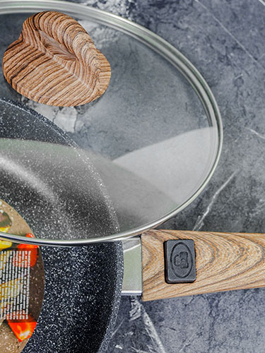 В комплект входит стеклянная, точно подходящая по размеру к сковороде крышка. Для правильной циркуляции воздуха на ней есть паровыпускное отверстие. На крышке устойчивая к износу ручка из бакелита с покрытием Soft-touch.