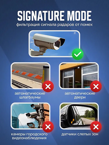 В больших городах существует много устройств, излучающих сигналы в диапазонах работы радаров (например, сигналы автоматических дверей). Для более комфортного вождения Вы можете выбрать специальные режимы работы: Трасса или Город 1 / Город 2 / Город 3, созданные для фильтрации ложных срабатываний
