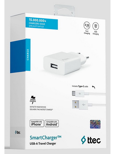 Сетевое з/у + DАТА кабель Ttec SmartCharger Travel Charger 2.1A с кабелем Type-C, белый (2SCS20CB) В наличии. |