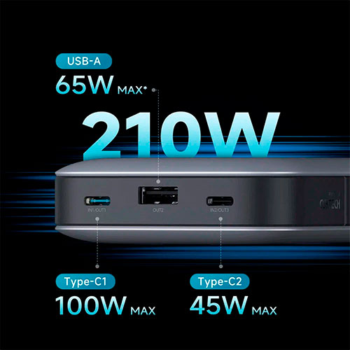 Одновременная зарядка устройств: 5 В ⎓ 6 A («OUT1» 5 В ⎓ 2 A, «OUT2» 5 В ⎓ 2 A, «OUT3» 5 В ⎓ 2 A), 9 В ⎓ 6 A («OUT1» 9 В ⎓ 2 A, «OUT2» 9 В⎓ 2 A, «OUT3» 9 В ⎓ 2 A), 12 В ⎓ 6 А («OUT1» 12 В ⎓ 2 A, «OUT2» 12 В⎓ 2 A, «OUT3» 12 В ⎓ 2 A), 15 В ⎓ 6 А («OUT1» 15 В ⎓ 2 A, «OUT2» 15 В⎓ 2 A, «OUT3» 15 В ⎓ 2 A), 20 В ⎓ 5 А («OUT1» 20 В ⎓ 5 A, «OUT2» 20 В⎓ 3.25 A, «OUT3» 20 В ⎓ 2.25 A) = максимальная мощность 210 Вт