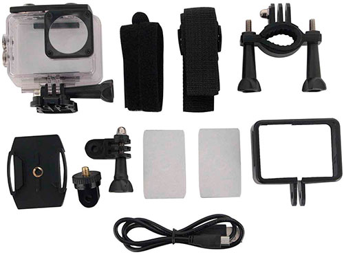 Камера поддерживает установку карт памяти типа microSD объемом до 128 Гб для создания настоящей галереи. Встроенный динамик и микрофон дают возможность записать звук и прослушать снятый материал. В комплектацию входят USB-кабель, крепление для плоской поверхности, крепление на руль, водонепроницаемый корпус, основное крепление, повязка-бандаж, рамка, 2 адаптера-кронштейна.