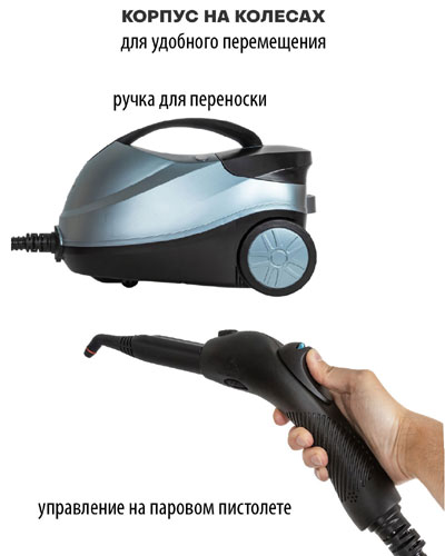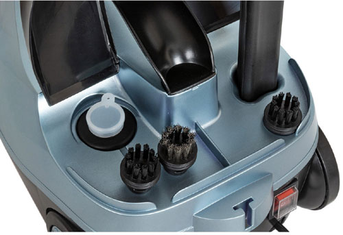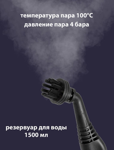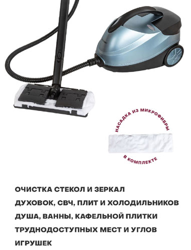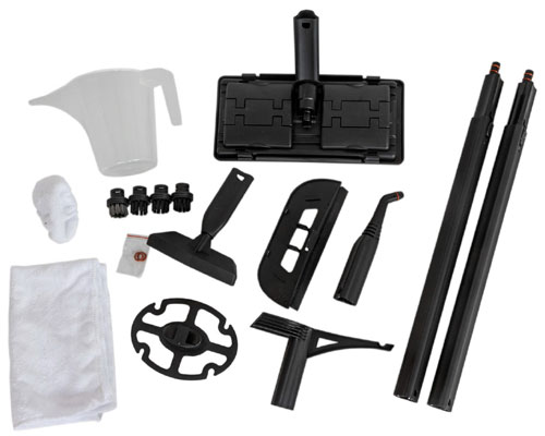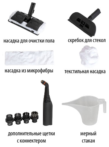 Комплектация: пароочиститель, мерный стакан, удлинительные трубки - 2 шт., плоская насадка для отпаривания, скребок для очистки стекол и зеркал, большая насадка, швабра, насадка на швабру для чистки ковров, держатель для смотки шнура питания, вешалка для одежды, круглая щетка металлическая, круглые щетки нейлоновые - 3 шт., текстильная насадка для отпаривания, текстильная насадка для швабры, гарантийный талон, инструкция на русском языке