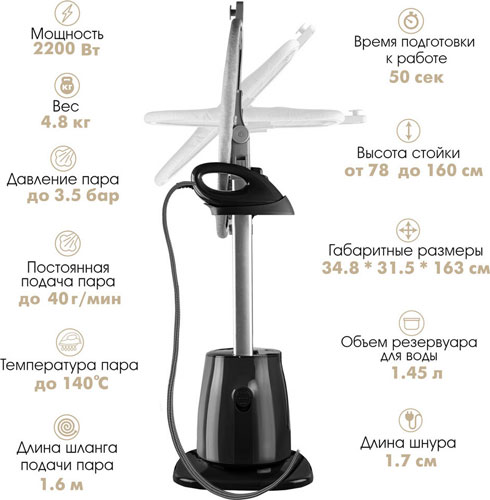 Готовность к работе всего за 50 секунд и непрерывная работа до 45 минут позволяют быстро справляться с большими объемами вещей. Съемная гладильная доска с тремя уровнями установки угла наклона и длина парового шланга 160 см делают процесс отпаривания удобным и комфортным.
