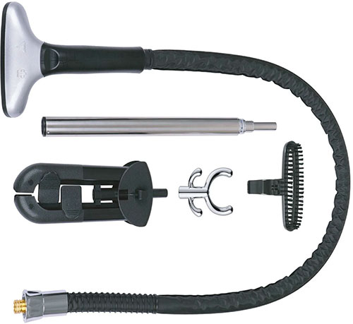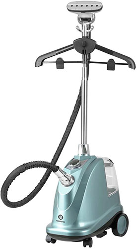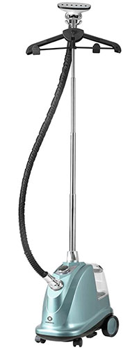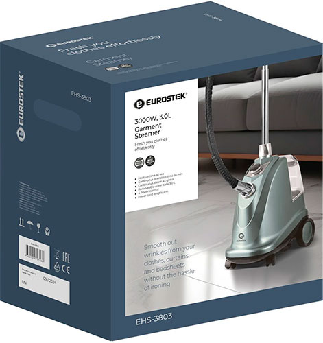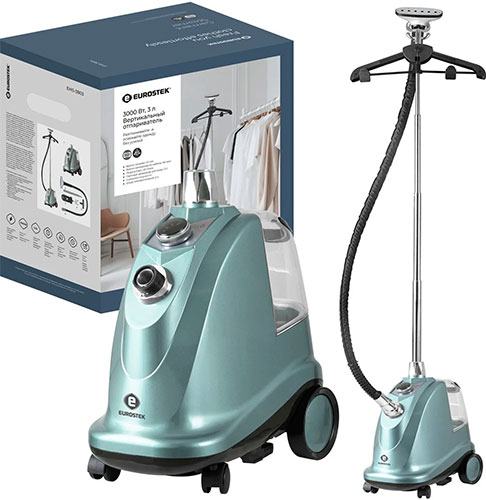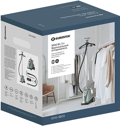 Отпариватель для горизонтального и вертикального отпаривания, Время нагрева 50 сек, Подача пара 45 г/мин. Время бесперебойной работы 66 мин, 4 режима мощности. Резервуар 3л. Телескопическая стойка от 0,47 до 1,75 м, Складная вешалка с дополнительными фиксаторами, держатель парового утюжка, щетка зажим, шланг с паровым утюжком, на дне место для хранения шнура электропитания