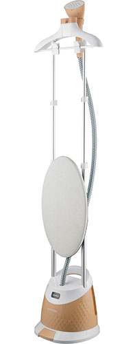 Отпарить одежду можно на вешалке либо на съемной гладильной доске. Доску можно установить на отпаривателе в вертикальном или горизонтальном положении. Телескопические шесты, на которых расположена вешалка, регулируются по высоте до 1,3 метра, что позволяет отпаривать вещи на удобном уровне. Устройство будет готово к работе через 30 секунд после включения с помощью кнопки в нижней части корпуса отпаривателя, которую удобно нажимать ногой.