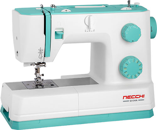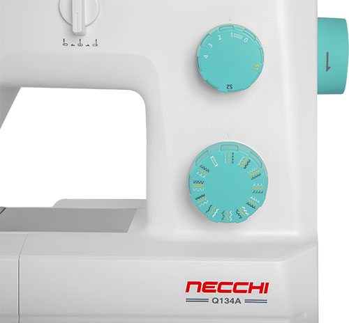 Швейная машина Necchi Q134A использует иглы типа 130 и 705 Н на горизонтальном пластиково-металлическом челноке. Способна производить три вида строчек (оверлочных - шесть, потайных - шесть, декоративных - 15) и 34 швейные операции. Тип выполняемой петли - автомат.
