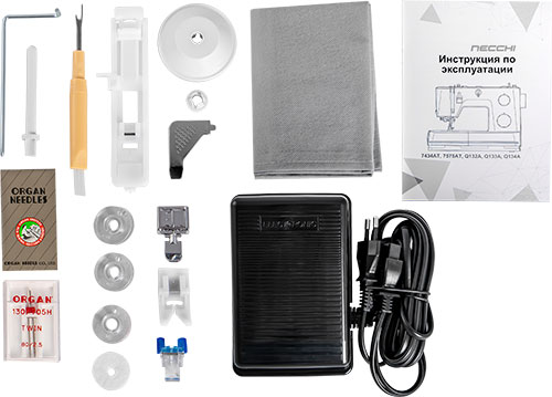 Вспарыватель, набор игл, шпульки, лапки для установки молний, пришивания пуговиц, выметывания петлей и обычных швов, отвертка, фетровый диск, направляющая для краеобметочного шва