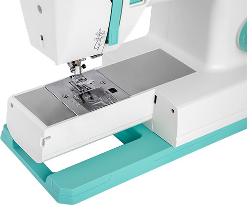 Пластиковый бирюзовый корпус размещает катушку в горизонтальной плоскости, отсек для аксессуаров, механизм вдевания нити, ручку для переноски, прорезиненные ножки педали.