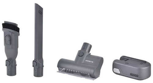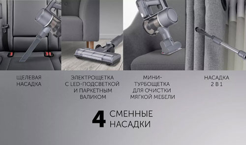 В набор входят 3 дополнительные насадки: щелевая, насадка 2 в 1, мини турбощетка, что позволяет чистить не только полы, но и мебель, диван, ковры, шторы, а также поддерживать чистоту в салоне автомобиля.