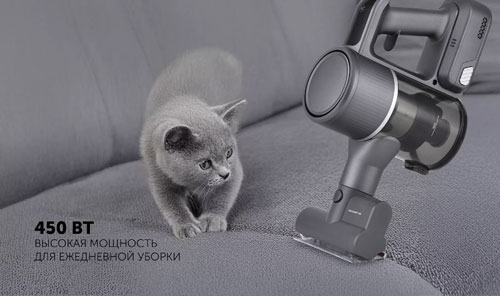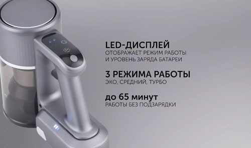 Устройство оснащено аккумулятором емкостью 2500 мАч, что обеспечивает до 65 минут автономной работы на одном заряде. Ручной пылесос с мощностью всасывания 150 аВт эффективно удаляет пыль, волосы, шерсть животных и другой мусор с различных покрытий, включая ковры, паркет, плитку и ламинат. Для разных типов загрязнений предусмотрены три режима мощности: эко, средний и турбо. Мощный аппарат предназначен только для сухой уборки.