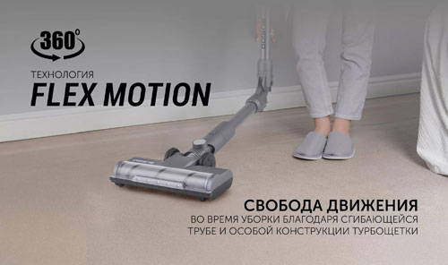 Технология Flex Motion дает свободу движения на 360 градусов благодаря сгибающейся трубе и особой конструкции устройства, что облегчает уборку труднодоступных мест. Встроенный контейнер для пыли объемом 0,45 литра очищается одним движением. В комплекте есть устойчивая напольная подставка, обеспечивающая удобное хранение прибора.