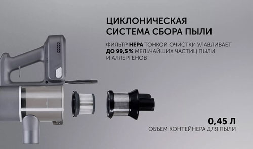 Универсальный аккумуляторный пылесос также оснащен LED дисплеем с удобным индикатором заряда, чтобы вы всегда знали, когда устройство нуждается в подзарядке. Уровень шума составляет всего 80 дБ. Циклоническая система сбора пыли с HEPA фильтром улавливает до 99,5% частиц пыли и аллергенов, улучшая качество воздуха в вашей квартире. Встроенная подсветка обеспечит дополнительное освещение зоны работы и поможет эффективнее производить очистку пола от загрязнений.