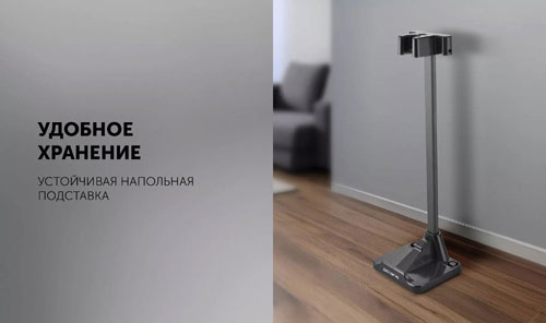 Комплектация: щелевая насадка, насадка 2 в 1, мини турбощетка, зарядное устройство, электрическая щетка для пола, напольная подставка, щеточка для очистки, батарея, труба