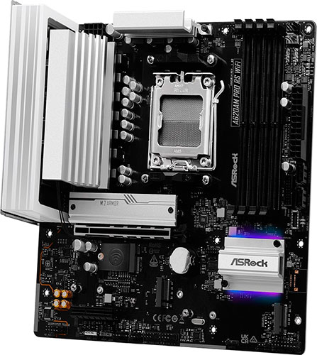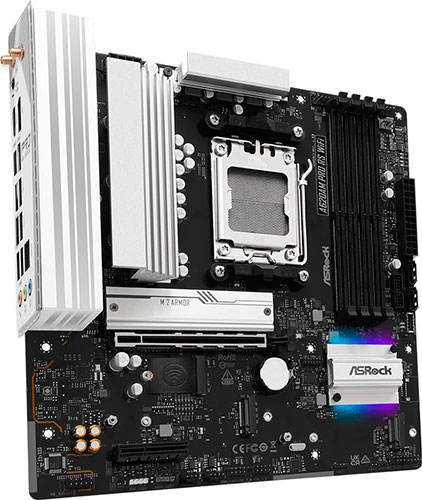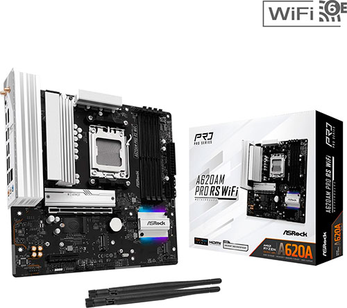 Материнская плата ASRock A620AM Pro RS WIFI – устройство форм-фактора Micro-ATX с размерами 244x244 мм подходит для сборки мощного универсального компьютера для дома или офиса. Плата работает под управлением чипсета AMD A620A и поддерживает процессоры AMD Ryzen 7000, 8000 и 9000. Схема питания 6+2+1 гарантирует реализацию потенциала мощных игровых CPU, а подсистема памяти с поддержкой технологий разгона AMD EXPO обеспечивает стабильность работы модулей DDR5. Максимальный объем ОЗУ равен 256 ГБ.