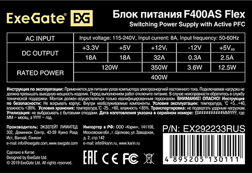 Блок питания ExeGate 400W F400AS Flex ATX (EX292233RUS) В наличии |